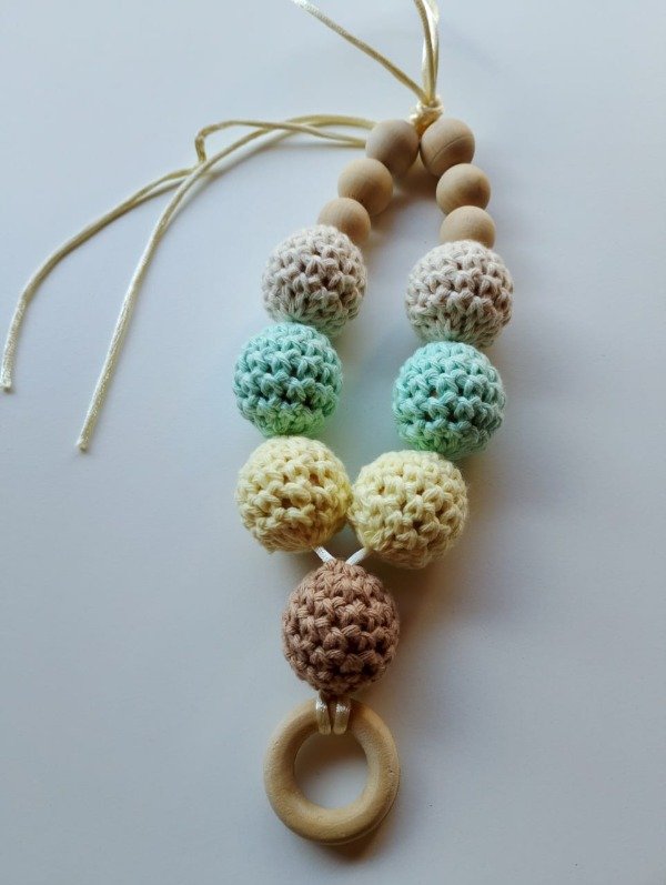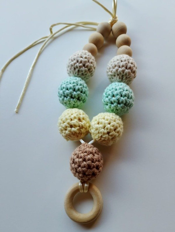 El collar de lactancia y porteo es el accesorio perfecto para mamás y bebés. Elaborado con bolitas de madera natural y esferas tejidas a mano en algodón hipoalergénico, ofrece un diseño funcional y estético que estimula al bebé mientras mamá lo carga o amamanta.
