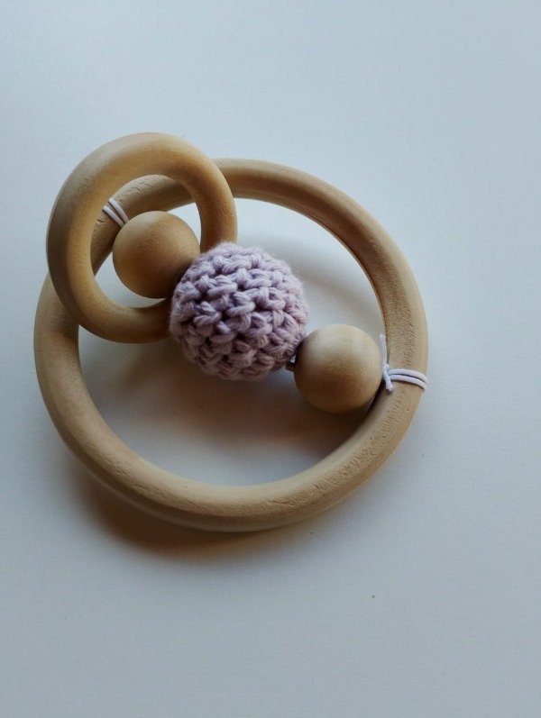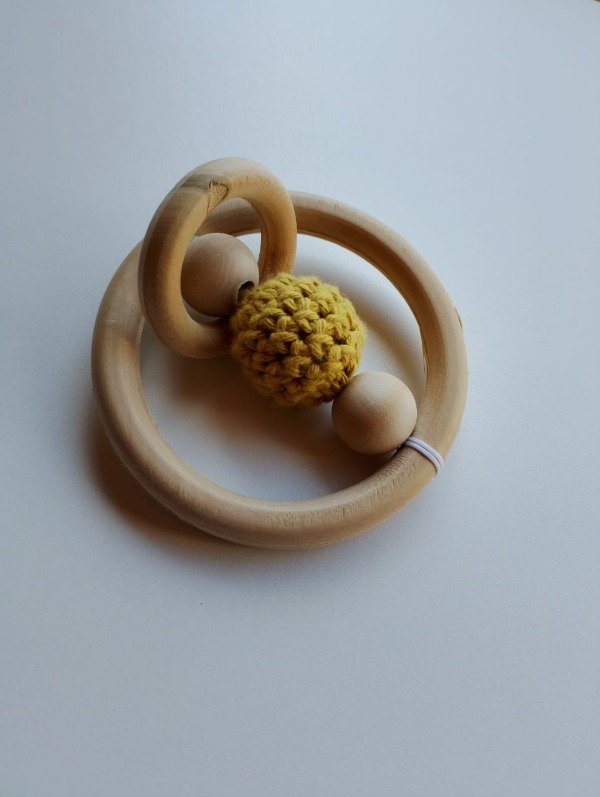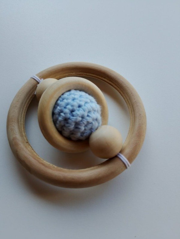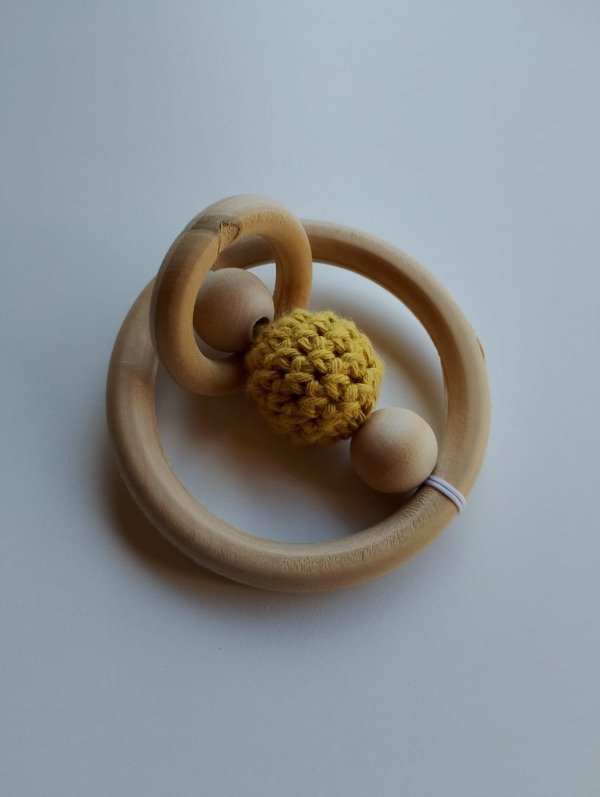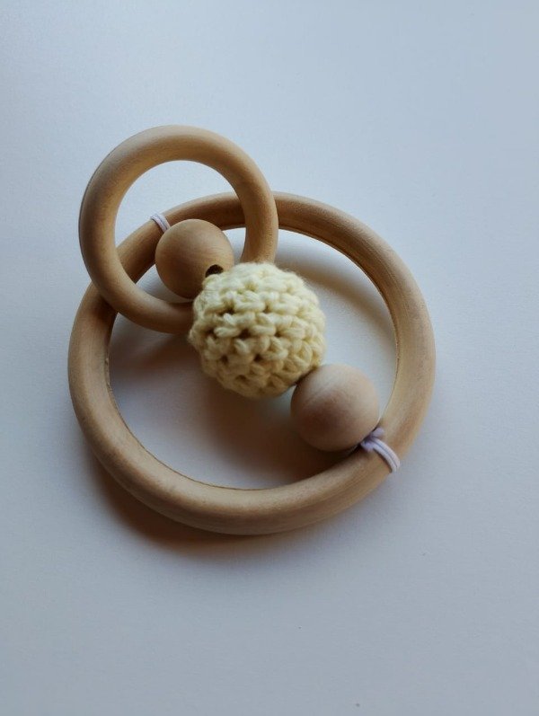 Nuestro sonajero de madera artesanal combina la suavidad de las bolitas tejidas a mano con la calidez de la madera natural. Diseñado para estimular los sentidos del bebé, este juguete es perfecto para agarrar, morder y agitar.