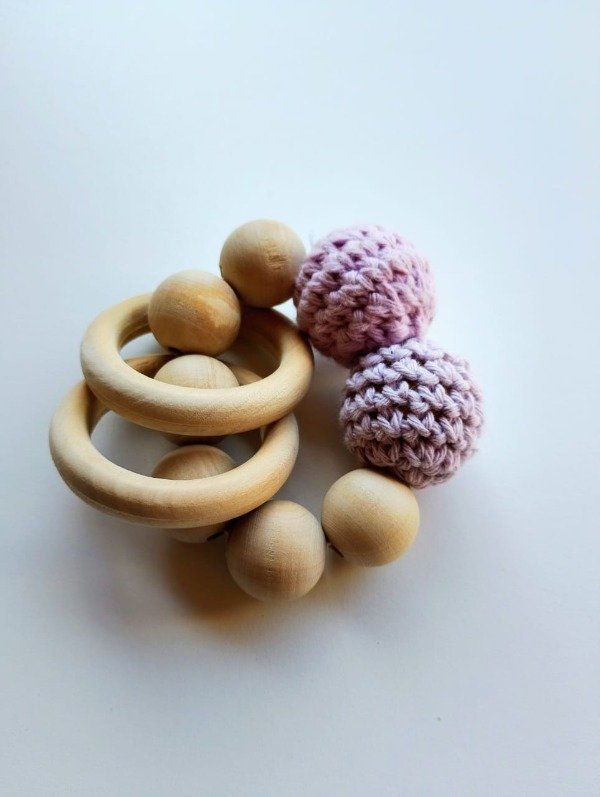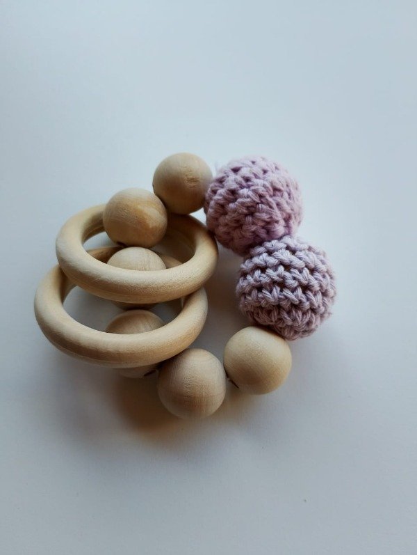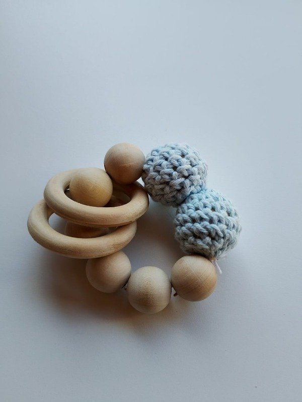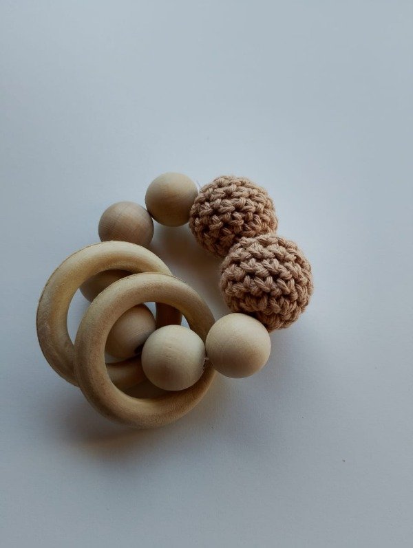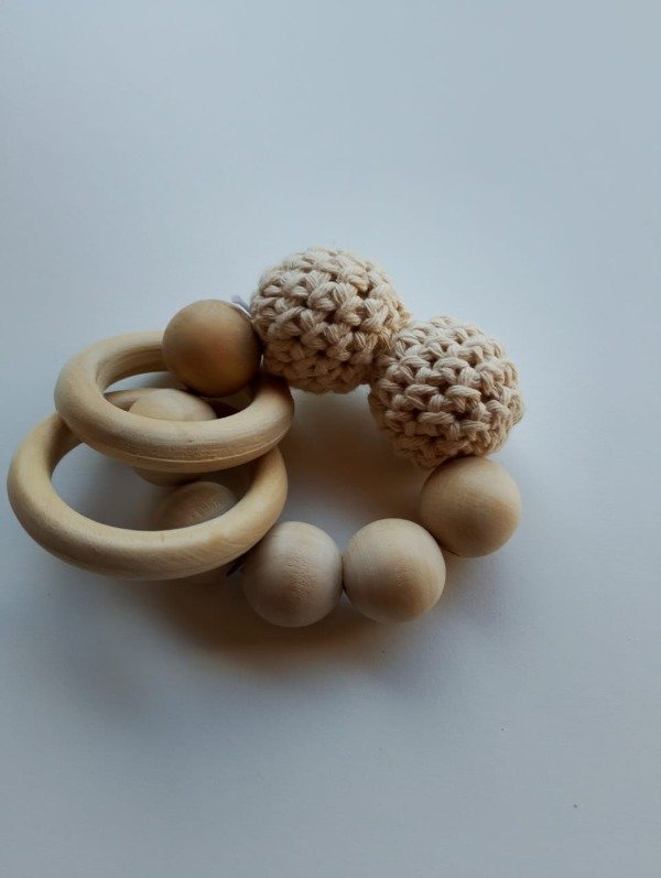 Nuestro sonajero de madera artesanal combina la suavidad de las bolitas tejidas a mano con la calidez de la madera natural. Diseñado para estimular los sentidos del bebé, este juguete es perfecto para agarrar, morder y agitar.